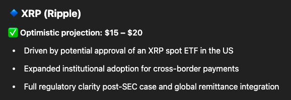 人工知能(AI)モデル ChatGPT は、リップル(XRP)、ソラナ(SOL)、および Pi Network(PI)ホルダーが楽観的である十分な理由があると考えており、これらのアルトコインが 2025 年末までに大幅な上昇を達成し、歴史的な最高値を記録することが期待されています。
