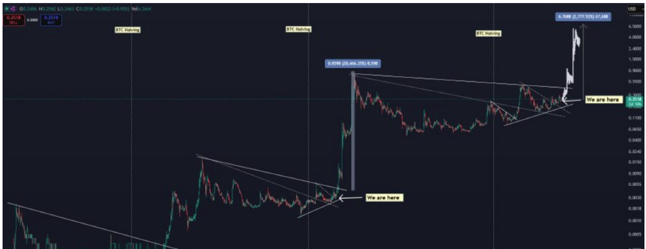 広い時間枠で、別の暗号市場の専門家がドージコインの市場構造が徐々に大きな上昇に向けて位置づけられていることを指摘しています。彼らの長期チャート分析は、DOGEの現在の価格動向と各ビットコイン半減イベントの前に観察された以前のサイクルとの間に驚くべき類似点を引き出しています。
