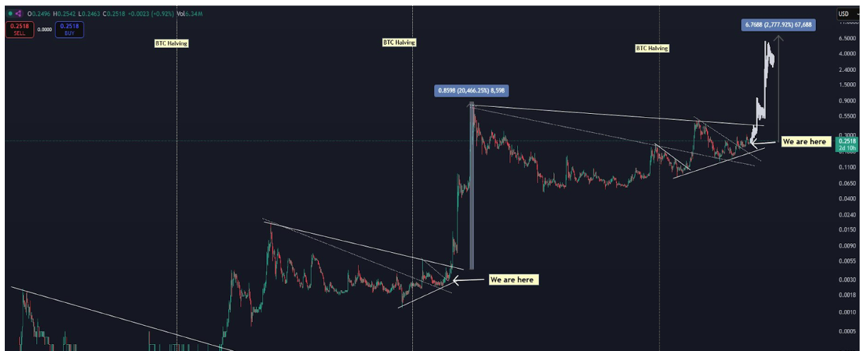 アナリストは、暗号通貨コミュニティのメンバーが、ドージコインがどのように高いレベルに達する準備ができているかにますます目覚めていることを指摘しました。投稿に添付されたチャートは、ドージコインが以前のビットコインの半減期の後にたどった歴史的なパターンを示しています。
