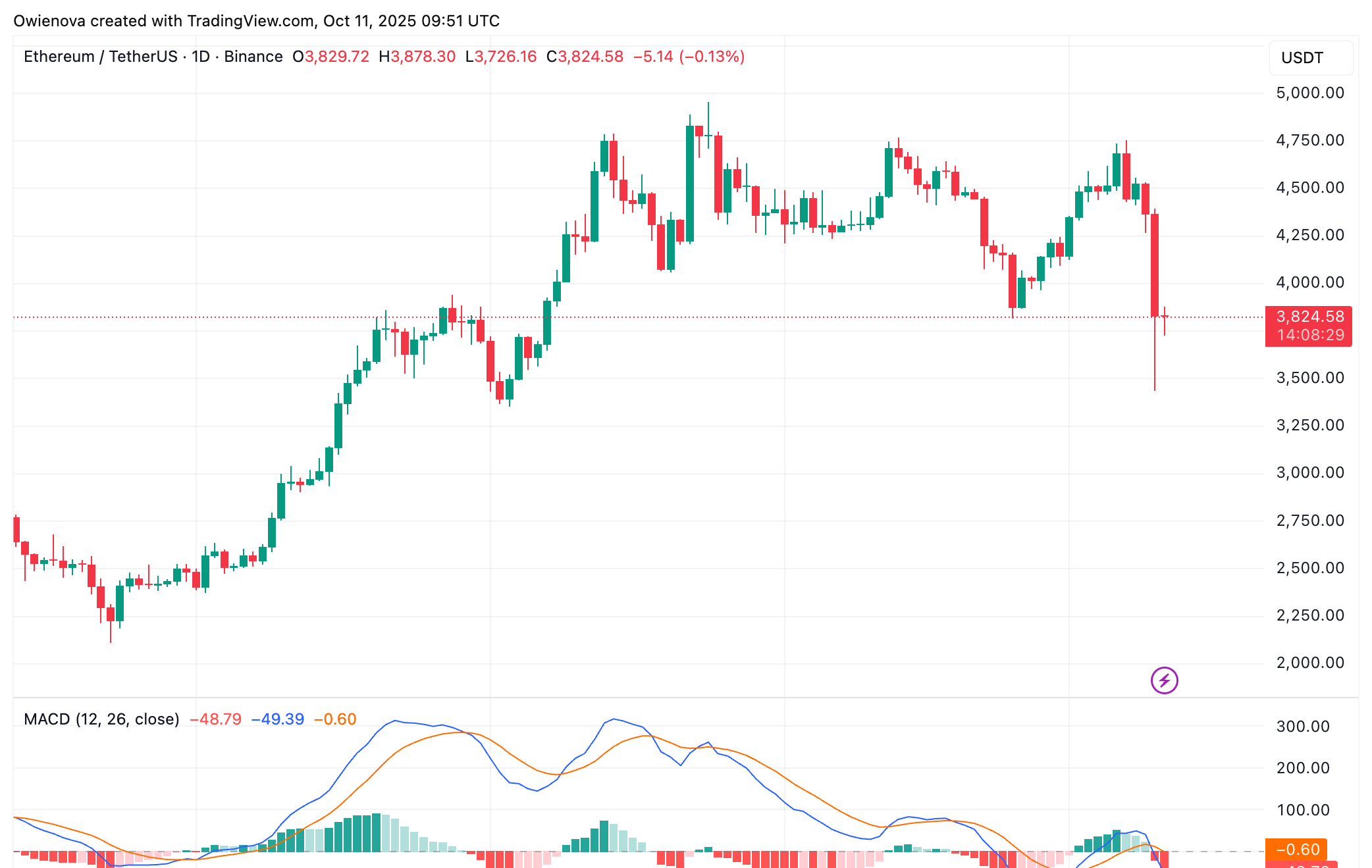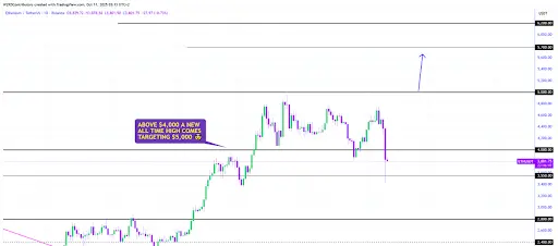 アナリストは結論として、イーサリアムの intraday チャートが、マーケットが歴史上最も激しい清算イベントの一つを経験した際に極端なボラティリティを示したと指摘しました。混乱にもかかわらず、彼は4,000ドルの水準を取り戻すことがイーサリアムを再びプラスの領域に置くと強調しました。