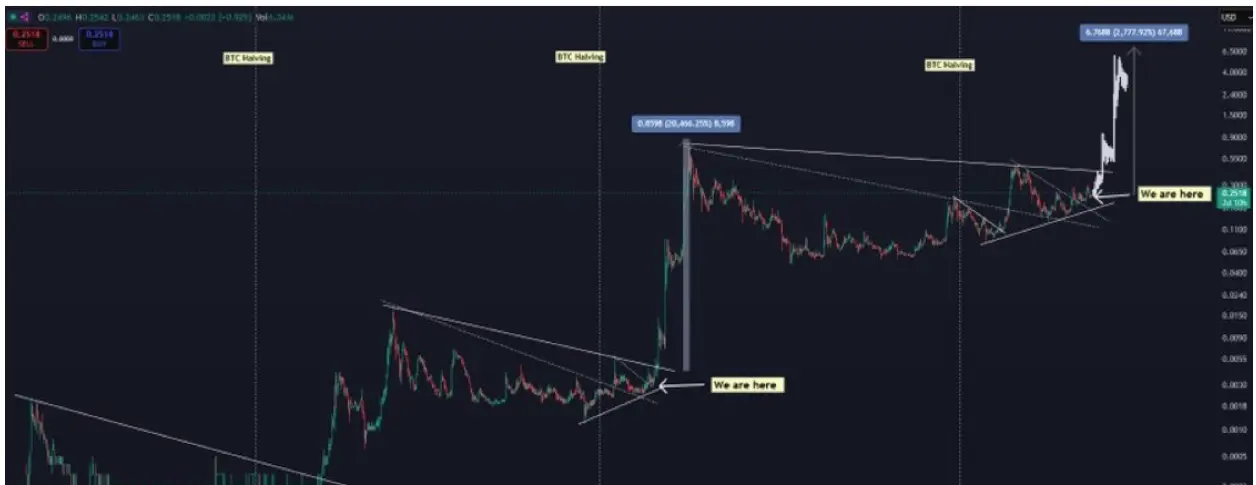 No passado, o Dogecoin tem consistentemente rompido triângulos descendentes de longo prazo pouco depois de um halving do Bitcoin, levando a explosões de preços. O gráfico mostra os rallies passados do DOGE a partir de formações semelhantes que produziram ganhos de mais de 20.000% em 2021 e 30.000% em 2027.
