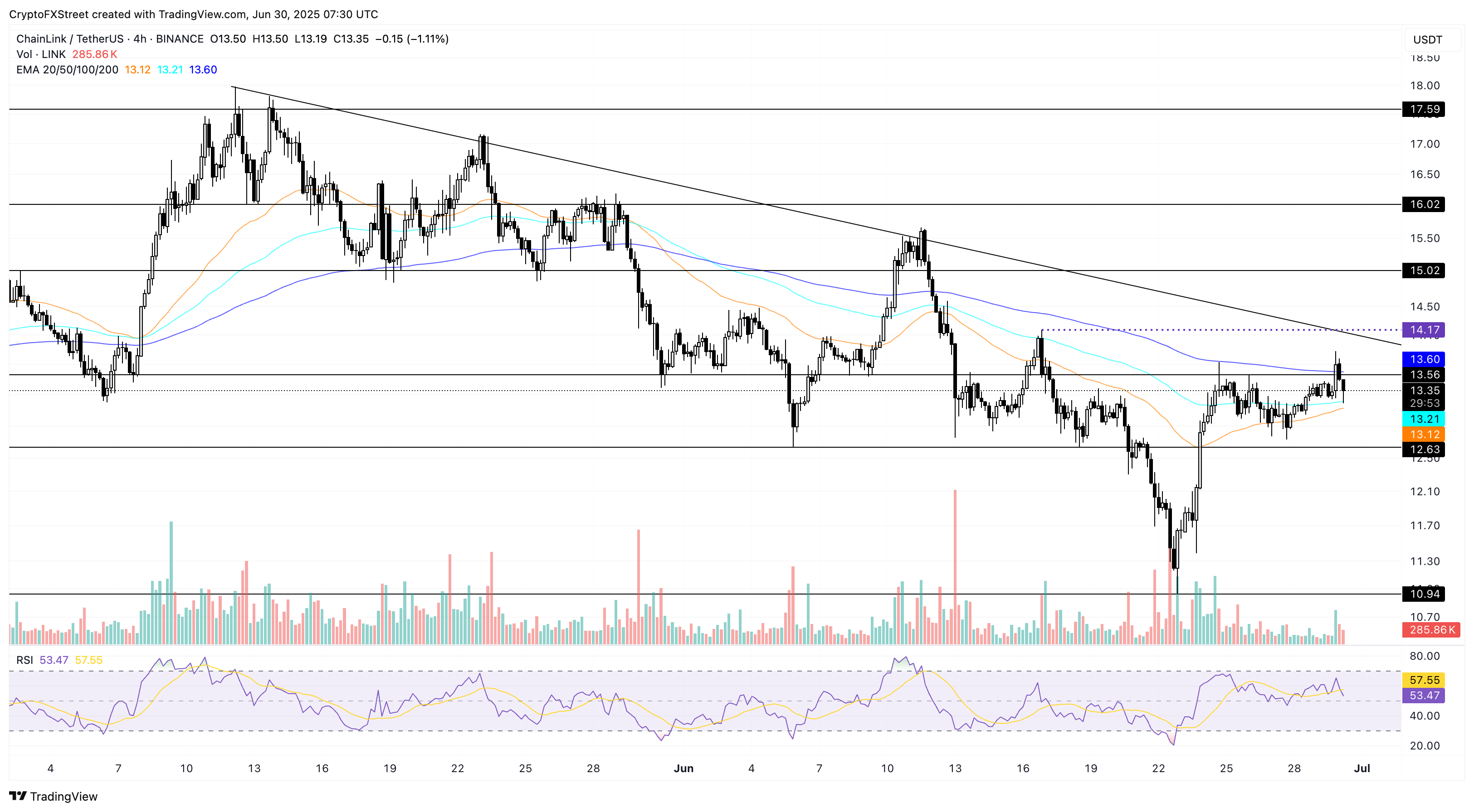 Якщо LINK знизиться нижче 50-тижневого EMA на 13.12 долара, спадний тренд може продовжитися до рівня підтримки в 12.63 долара, який востаннє тестувався 18 червня. Індикатор відносної сили (RSI) становить 52, вказує вниз і відскакує від зони перекупленості, що свідчить про швидку втрату купівельного тиску.
